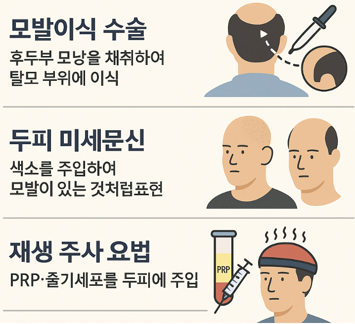 탈모는 삶의 질에 직접적인 영향을 미치는 문제다. 약물치료가 효과적이지 않거나 이미 진행이 많이 된 경우, 모발이식, 두피 문신, 주사 요법, 레이저 치료 등 성형적 접근이 현실적인 대안이 될 수 있습니다. 중요한 것은 최신 연구 결과와 자신의 상태를 근거로 맞춤 치료를 선택하는 것이며, 반드시 경험 있는 전문의를 통해 충분한 상담을 거쳐야 합니다.